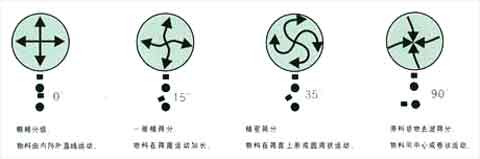 2.旋振篩上錘不可調(diào)整角度,打開底桶調(diào)整孔,松開下重錘固定螺栓,根據(jù)所篩分物料軌跡,向出料口反方向調(diào)整上下重錘的相位角(參照下圖)。然后將少量物料放在篩網(wǎng)上面,使篩機(jī)運(yùn)轉(zhuǎn),做篩面物料運(yùn)動軌跡檢查,如處理參數(shù)都達(dá)到更佳效果時,停機(jī)上緊固定螺栓,調(diào)整就結(jié)束了(切記上緊固定螺栓)。